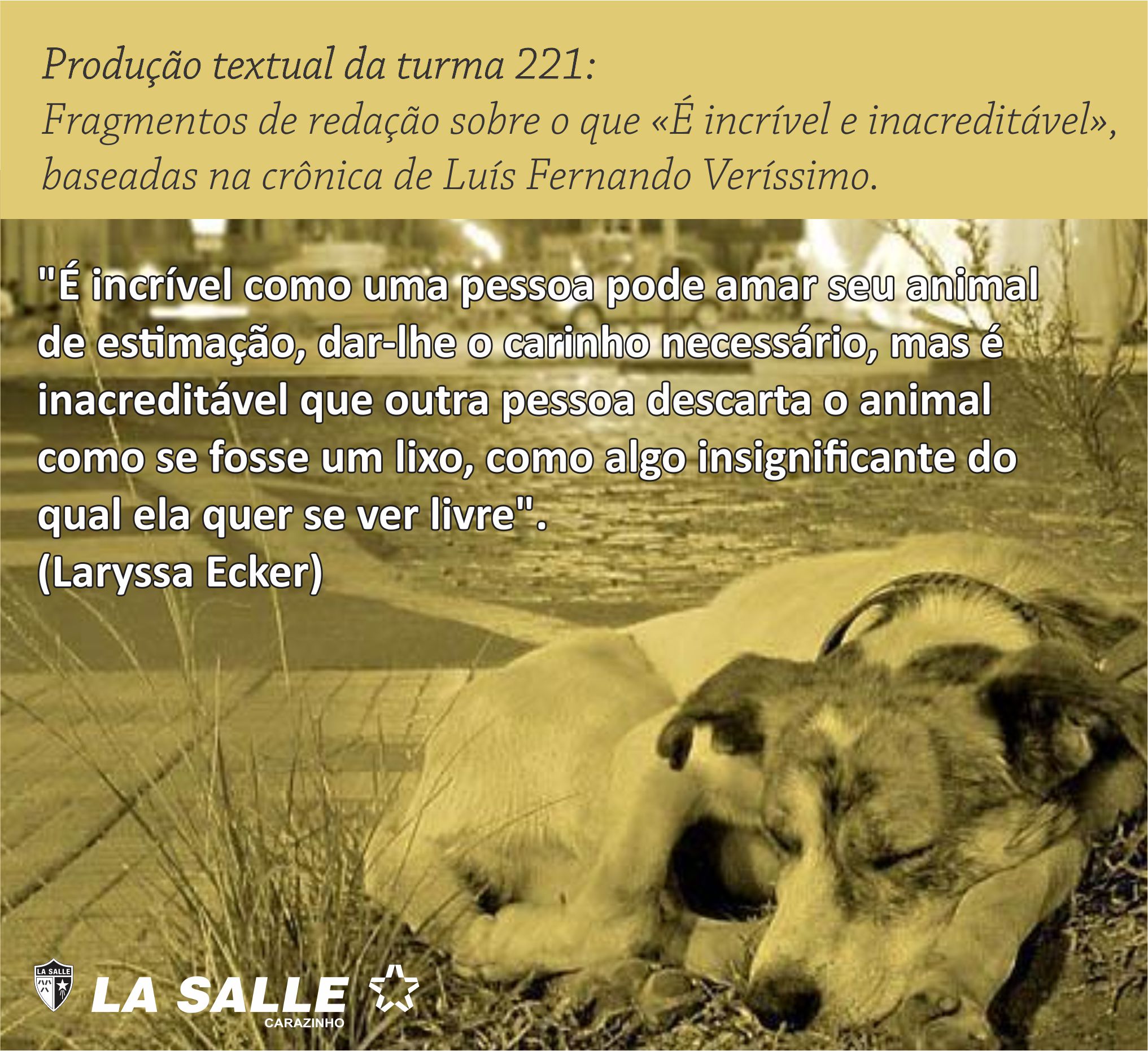 Confira a série de imagens criadas a partir da produção textual da turma 221, coordenados pela Profª Maria Solange da Costa Folchinni.Os fragmentos de redação foram produzidos a partir da reflexão das crônicas de Luís Fernando Veríssimo sobre o que "É incrível e inacreditável".