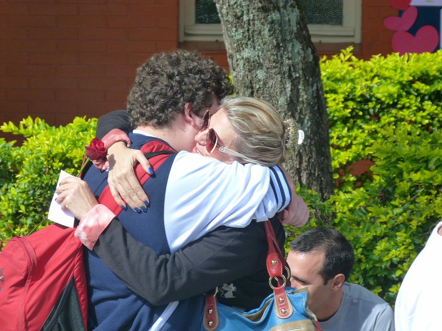 Mas o momento ficou marcado pelo abraço forte que cada aluno deu em sua mãe durante a entrega das rosas e cartões feitos por eles.