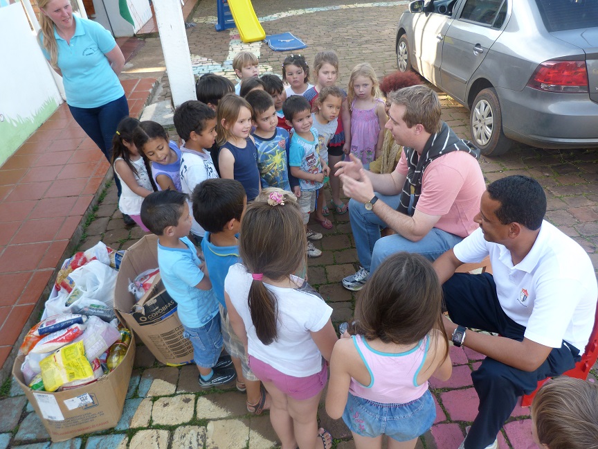 Durante a entrega dos alimentos, o Irmão Jorge e o professor Alaor aproveitaram para contar histórias, cantar e rezar com as crianças, trabalhando um dos principais valores lassalistas: a solidariedade.