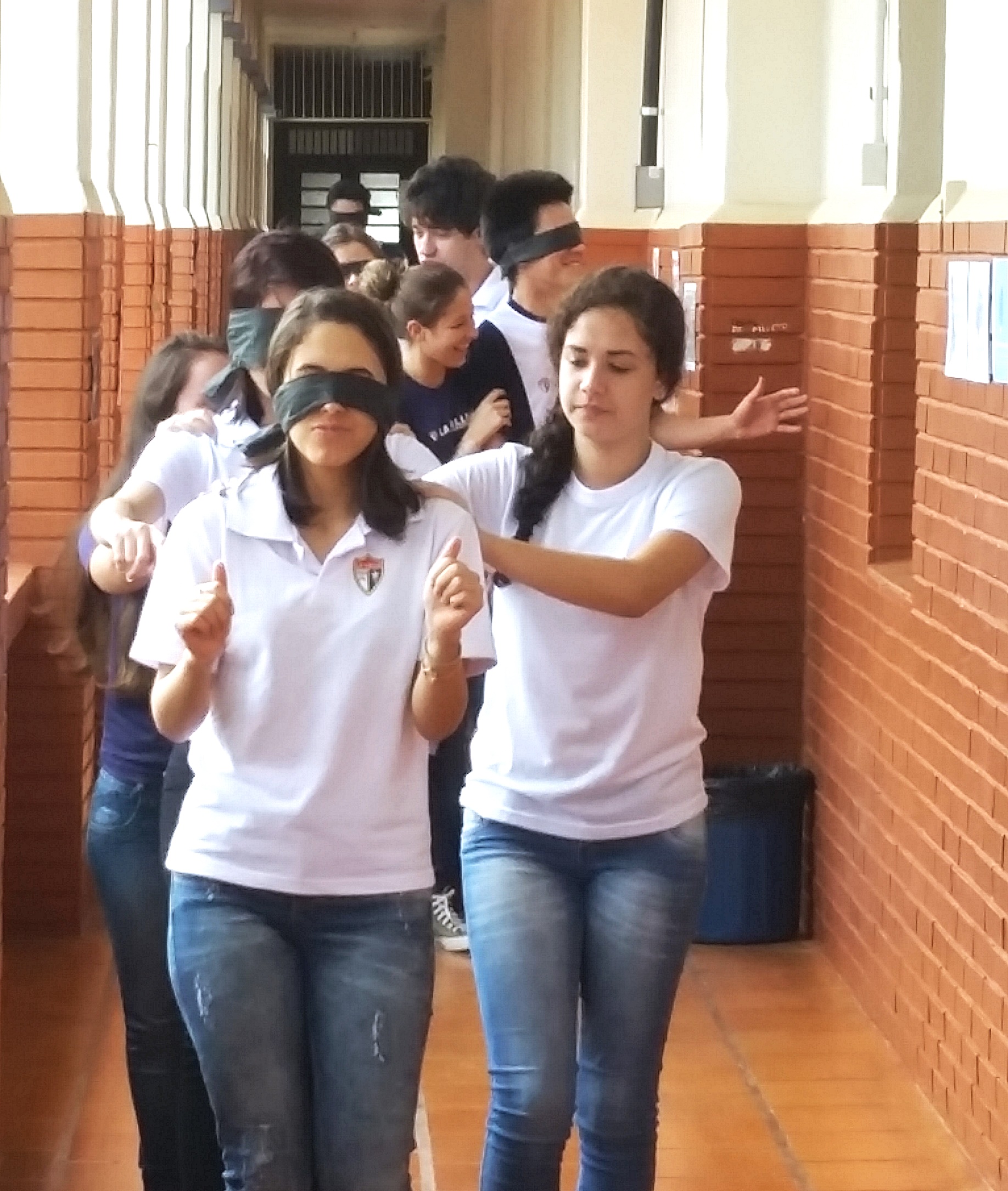 As turmas realizaram uma dinâmica, onde precisavam CONFIAR em seus colegas para realizar um passeio pela escola de olhos vendados, e desta forma, puderam perceber o quanto precisamos confiar nas pessoas e em sua capacidade de superar limites.