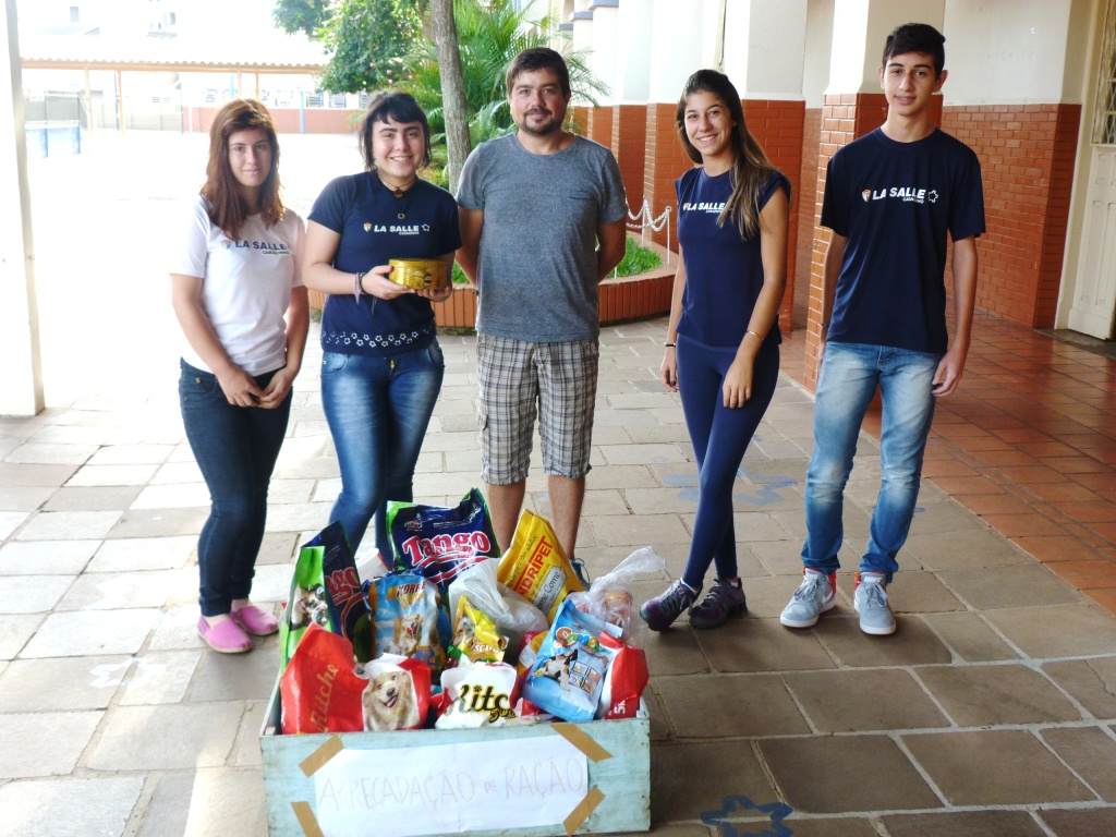 Os alunos do 3º ano do Ensino Médio e integrantes da Diretoria do Grêmio Estudantil entregaram, na manhã desta segunda-feira (18), as doações arrecadadas no Colégio La Salle em benefício da ACAPA. Foram entregues 55 quilos de ração e R$ 250,00 ao representante da Associação, Germano Otto Puttltz, que relatou a dificuldade da entidade em atender 420 animais que estão na sede e mais de 200 animais fora.