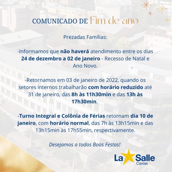-Turno Integral e Colônia de Férias retornam dia 10 de janeiro, com horário normal, das 7h às 13h15min e das 13h15min às 17h55min, respectivamente.