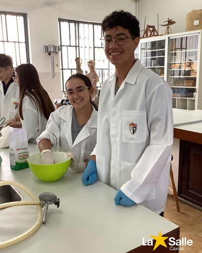 Na aula prática com a 1ª série do Ensino Médio, os estudantes realizaram a extração do glúten a partir de farinha de trigo, compreendendo na prática o que é essa importante proteína presente nos cereais e suas propriedades, como elasticidade e resistência.