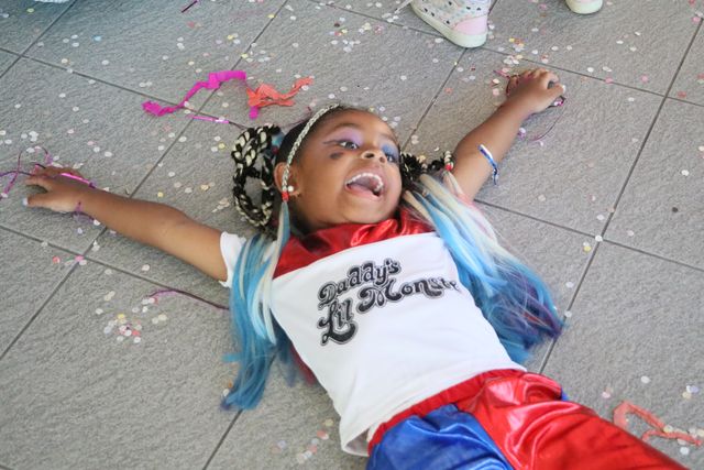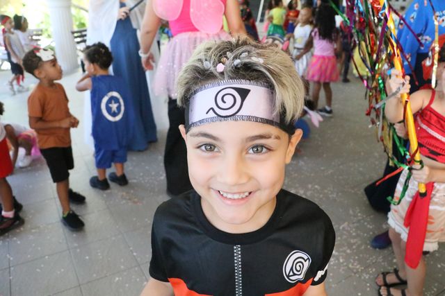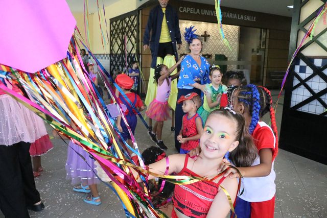 Ayla Eva é a Arlequina que se encontrou no Carnaval brasileiro. De tão feliz ela se joga no chão, faz da cama de confetes cenário semelhante a neve, abrindo e fechando braços e pernas enquanto carrega no rosto seu maior sorriso. O Hulk Bernardo, então, estava em gargalhadas nos braços da mediadora Heliza. Luiz Gael, com seus cabelos platinados, faz questão de dizer que é Naruto enquanto Aurora revela sua fantasia inédita com um rugido: ela é o leão, o rei da floresta. No Bailinho de Carnaval da Escola La Salle o que não falta é criatividade e diversão. Em mais um ano, a festa esteve completa com a participação de pernaltas da Oficina Flutuandas (nesta edição os pernaltas eram a professora Cecilia Guimarães, coordenadora das Licenciaturas do Unilasalle, e Edauro Vidal, que veio fantasiado de Menino Maluquinho). Assim como em 2025, um grande e colorido estandarte puxou o bloco da Escola na Varanda Cultural. A coordenadora pedagógica Maviane Lima o entregou para Maithê, do Pré II B, que puxou o trenzinho da folia na manhã deste dia 13 de fevereiro.