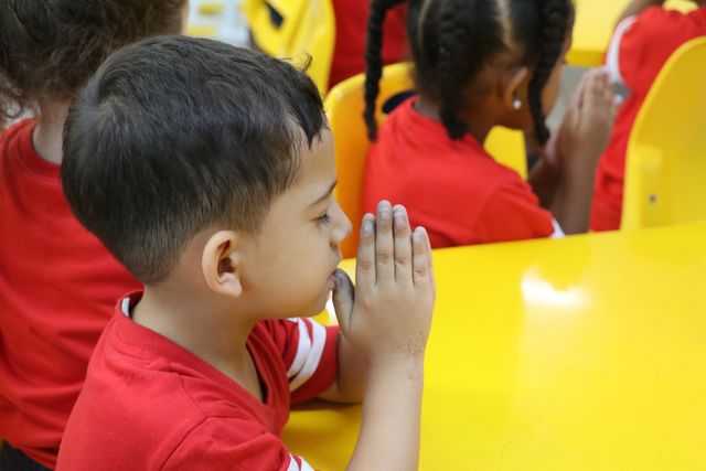 Depois de rezarem, cantarem com o tio Ramon, da pastoral do Colégio, e serem abençoados, nossos pequenos ainda foram aspergidos com água benta.