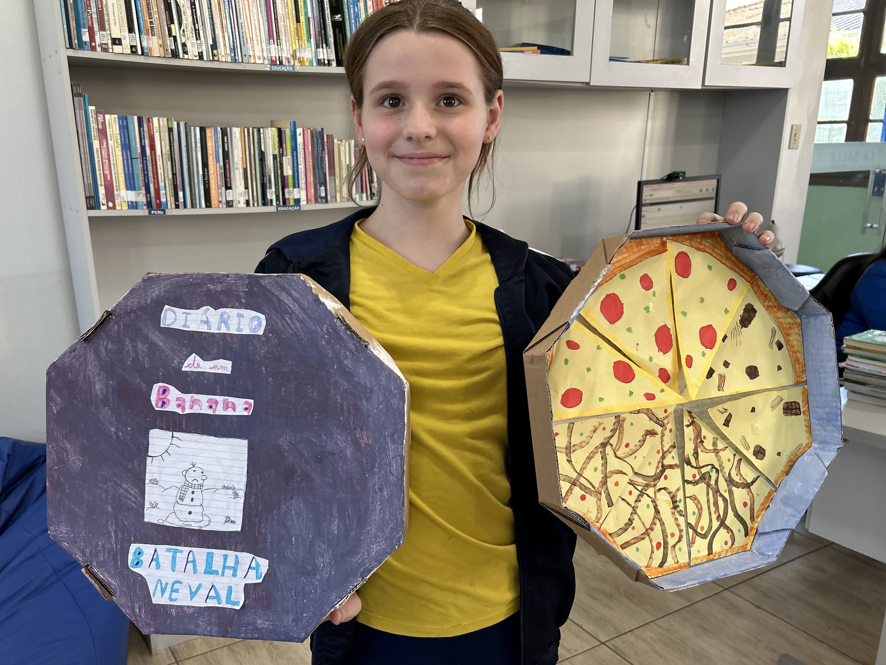 Cada aluno escolheu uma obra para ler e recebeu uma caixa de pizza de verdade, na qual reproduziu a capa do livro com canetinhas e tintas. Ao abrir a caixa, os conhecimentos adquiridos na leitura foram organizados em fatias, de modo a tornar a compreensão mais simples e atrativa.