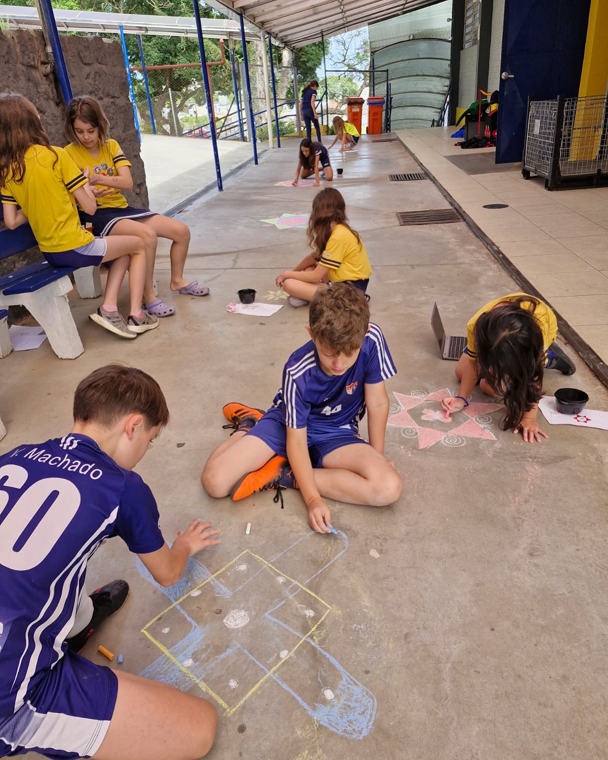 Os estudantes do Turno Complementar embelezaram nosso pátio com Arte Kolam, uma técnica tradicional oriental que consiste na criação de desenhos geométricos ou padrões simbólicos no chão! Os desenhos são frequentemente compostos por linhas curvas desenhadas sobre uma grade de pontos, e a simetria, precisão são valorizadas. É vista como uma forma de meditação, exigindo atenção plena e concentração durante a sua criação.