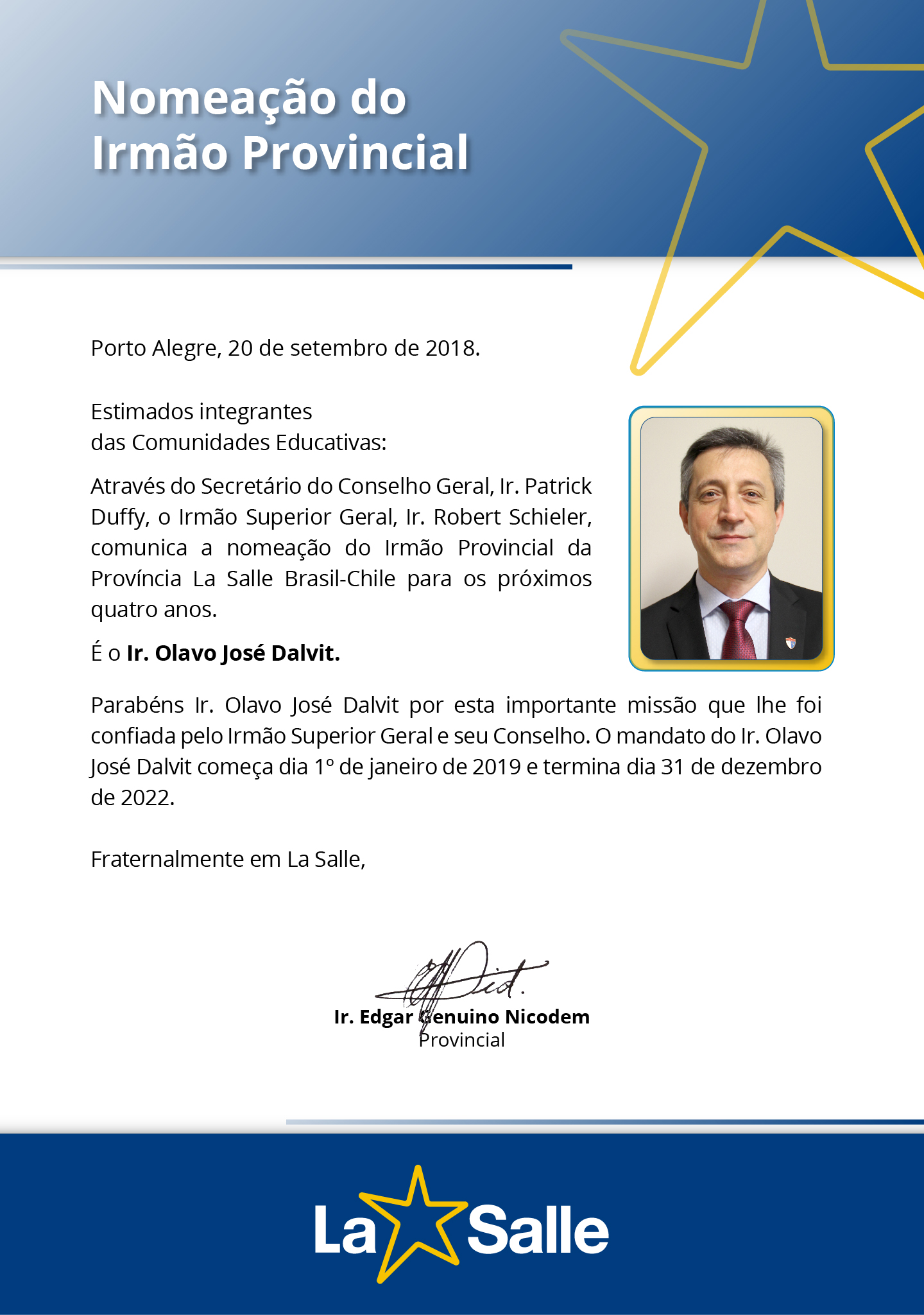Em 19 de setembro, foi divulgada pelo Instituto dos Irmãos das Escolas Cristãs, em Roma, a nomeação do Ir. Olavo José Dalvit para a função de Provincial da Província La Salle Brasil-Chile e Presidente da Rede La Salle, no período de 1º de janeiro de 2019 a 31 de dezembro de 2022. A informação foi oficializada pelo Secretário do Conselho Geral, Ir. Patrick Duffy, em nome do Superior Geral, Ir. Robert Schieler.