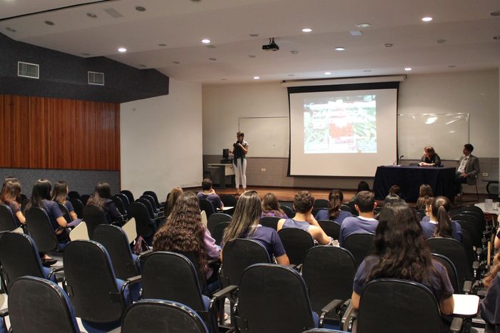 Estudantes do Ensino Médio receberam a nutricionista Andreia Meireles, especialista em Terapia Nutricional, e Michael Brant, professor de Educação Física do La Salle Abel, para um bate-papo sobre Alimentação Saudável, mediado pela professora de Redação Cristina Margalho, na tarde do dia 09 de setembro, no auditório do EM.