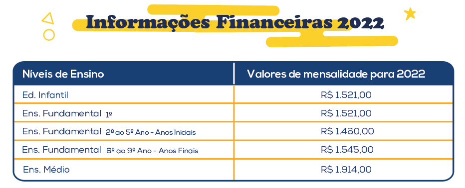 O Contrato de Prestação de Serviços Educacionais estará disponível no nosso site a partir do dia 25/10 de 2021, para que possa ser lido antes da realização da renovação de matrícula. Caso haja alteração do Responsável Financeiro, o NOVO Responsável Financeiro deverá procurar a Central de Atendimento no período de renovação, sendo vedada, nesse caso, a renovação de matrícula on-line. Assim, em atendimento à Lei nº 9.870/99, que dispõe sobre o valor das anuidades escolares, cumpre-nos esclarecer que as anuidades da Educação infantil e dos Ensinos Fundamental e Médio passarão a ter os seguintes valores no ano letivo de 2022, em doze parcelas fixas: