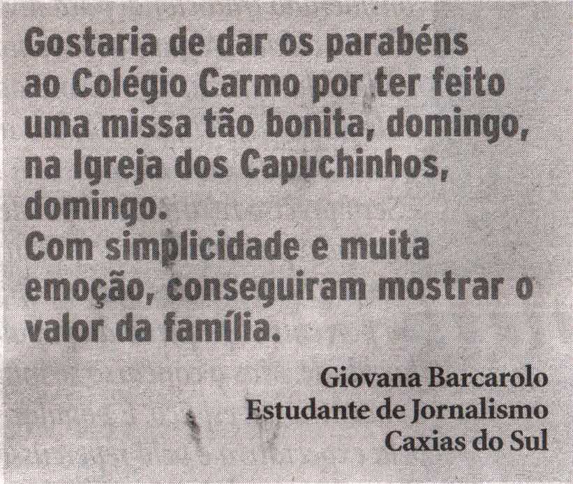 No Jornal Pioneiro desta terça-feira, 02 de setembro, a redação publicou uma carta de Giovana Barcarolo. Na mensagem, a estudante de Jornalismo afirma que o evento conseguiu mostrar o valor da família. A escola agradece o carinho de Giovana e a presença da comunidade e de todos os Lassalistas na Celebração da Família.