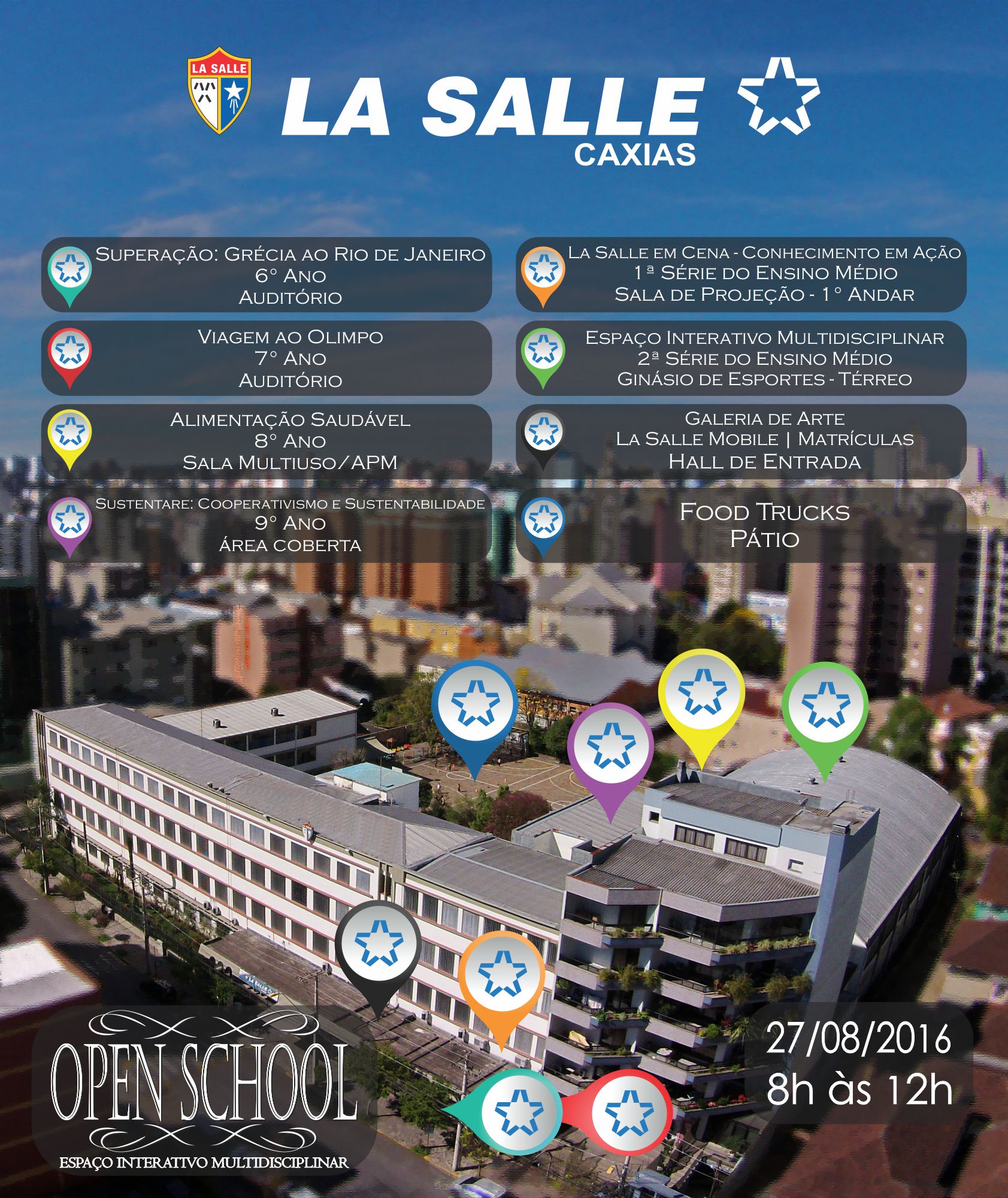 No próximo sábado, dia 27, o La Salle Caxias receberá a comunidade para um dos momentos mais esperados do período letivo: o Open School. A escola estará aberta, das 8h às 12h, para mostrar os resultados de diferentes trabalhos realizados desde o início do ano pelas turmas de 6° ano do Ensino Fundamental à 2ª série do Ensino Médio. O evento contará também com Food Trucks no pátio e um espaço diferenciado para matrículas e para o La Salle Mobile. Conheça a localização de cada ambiente, clicando aqui, e participe!