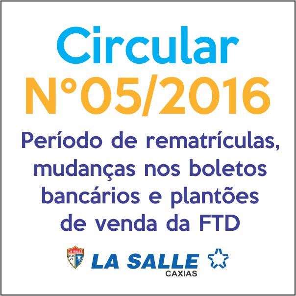 Hoje pela manhã foi iniciado o período de rematrículas do Colégio La Salle Caxias. Conforme a Circular N°05/2016, divulgada aqui no site e entregue a todos os alunos, as rematrículas acontecem entre os dias 23 de novembro e 05 de dezembro, com momentos específicos para cada ano/série. No mesmo documento foram destacadas também as principais mudanças no processo de cobrança bancária e, a partir do próximo mês, os boletos de mensalidades estarão disponíveis apenas no Portal do Aluno. Todos os detalhes podem ser conferidos clicando aqui e a Secretaria e a Tesouraria da Escola estão disponíveis para quaisquer esclarecimentos.