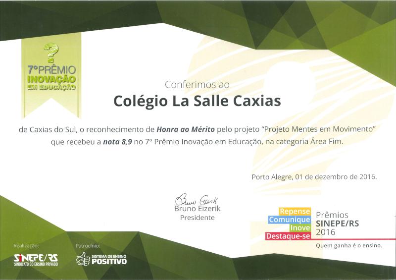 Tão importante quanto o reconhecimento dos aprendizes é o reconhecimento dos mestres. E a equipe do La Salle Caxias foi devidamente reconhecida nos Prêmios SINEPE/RS 2016. O Sindicato do Ensino Privado do Rio Grande do Sul realizou, no início do mês, a solenidade de premiação, concedendo uma Menção Honrosa ao Colégio na categoria “Inovação em Educação”. O projeto homenageado foi a “Gincana Mentes em Movimento” que, já em sua 3ª edição, reúne anualmente os alunos de 3°, 4° e 5° ano do Ensino Fundamental para momentos lúdicos de integração e aprendizado, tanto na escola quanto fora dela. As professoras Ana Crist e Denise Alves estiveram presentes na noite do evento, representando o La Salle Caxias e recebendo o merecido prêmio!