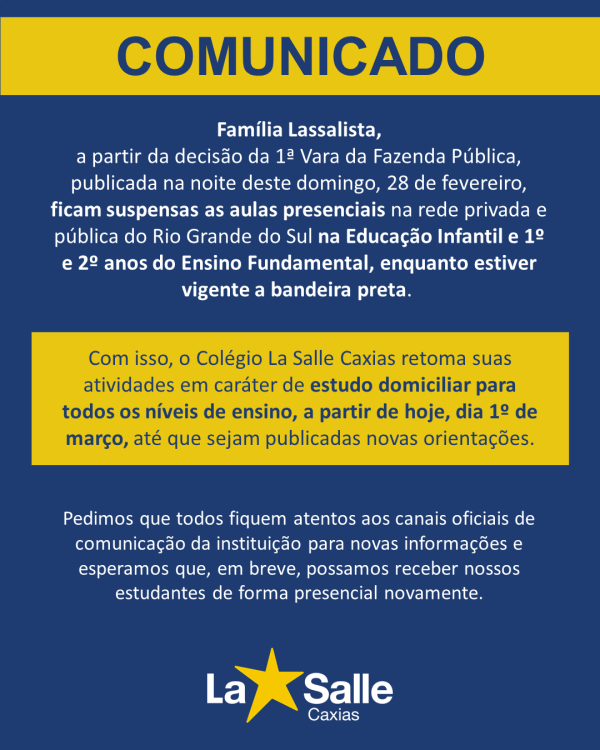 Com isso, o Colégio La Salle Caxias retorna suas atividades em caráter de estudo domiciliar para todos os níveis de ensino, e a partir de hoje, dia 1º de março, até que sejam publicadas novas orientações.
