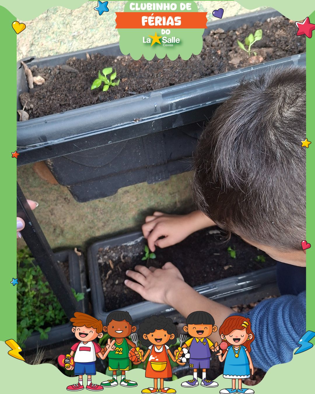 Mãos na terra, corações cheios de alegria! Dia de plantar mudas e cultivar sonhos na nossa hortinha, aprendendo sobre responsabilidade, cuidado e natureza. Um dia de terra molhada e descobertas verdes!