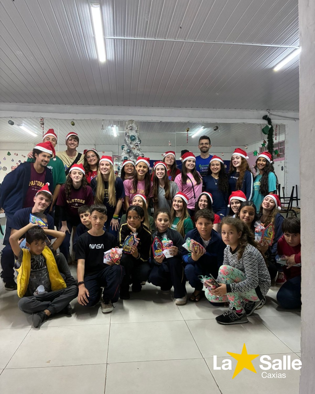 No dia 10/12, o Núcleo Sou Solidário e os Grupos de Jovens do La Salle Caxias estiveram presentes no Centro Assistencial e de Promoção Social Joana D’Arc, localizado no bairro Santa Fé, para realizar a entrega de kits de doces e enfeites natalinos, dentro da campanha do Natal Solidário.