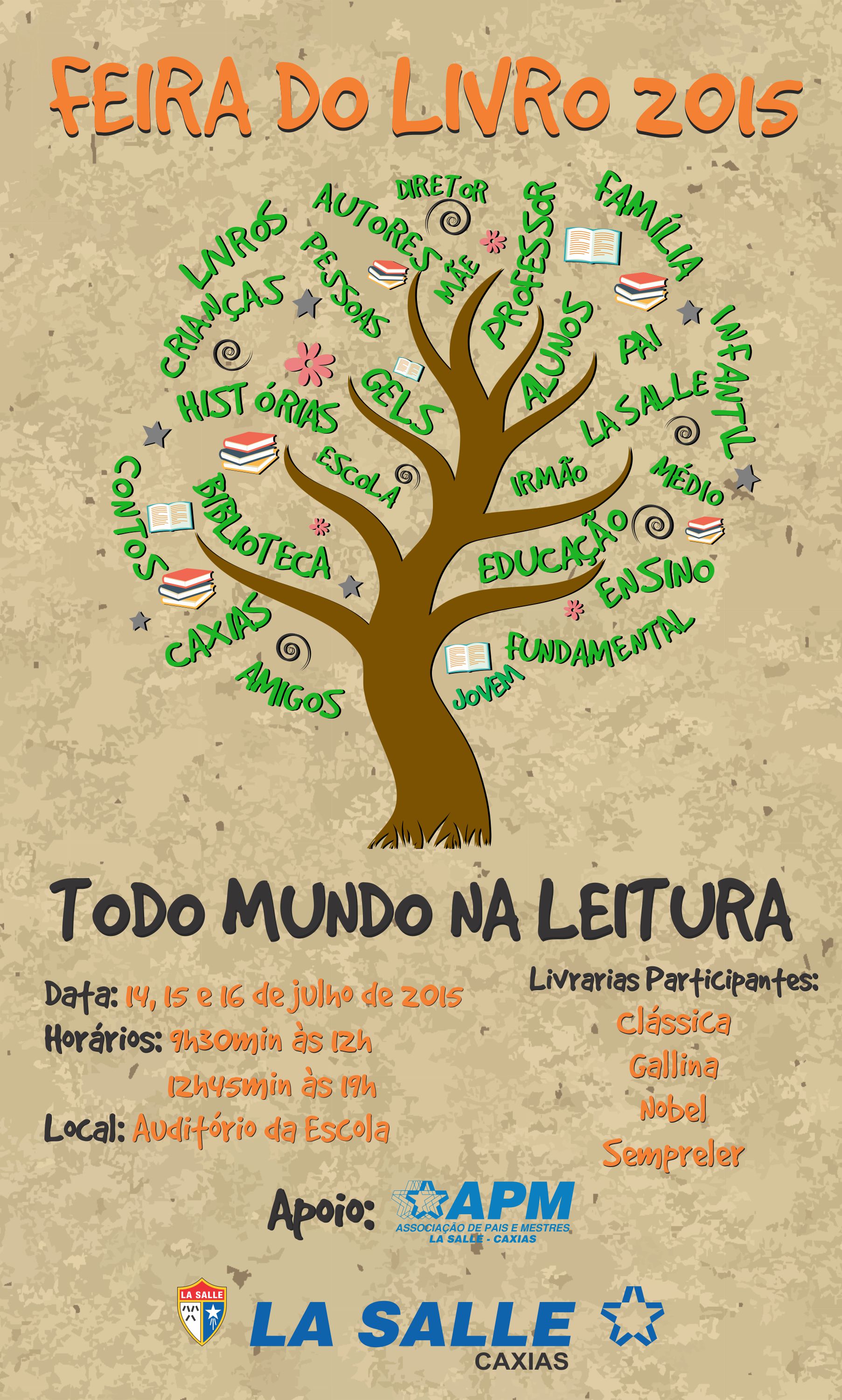 Está chegando a Feira do Livro 2015 do Colégio La Salle Caxias! Contando com o apoio da Associação de Pais e Mestres (APM), a Feira acontecerá nos dias 14, 15 e 16 de julho e terá a presença das livrarias Clássica, Gallina, Nobel e Sempreler. O evento estará aberto à comunidade caxiense das 12h45min às 13h30min e das 17h45min às 19h. Participe e junte-se a todo mundo na leitura!