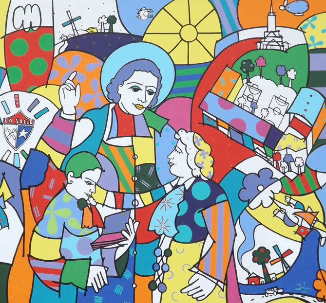 A sessão cívica da tarde de hoje trouxe mais uma vez a arte de Fabio Balen ao La Salle Caxias. Um quadro especial, criado pelo artista, ilustra São João Batista de La Salle, o brasão e o prédio da Escola através de traços únicos e coloridos, sendo apresentado aos alunos antes do arriamento das bandeiras. Na área da nova Educação Infantil, adesivos personalizados estão sendo aplicados por toda a extensão do espaço, contrastando com o quadro e colorindo ainda mais o nosso pátio. As crianças da Educação Infantil e do 3° e 4° ano do Ensino Fundamental tiveram a oportunidade de participar dessa novidade, posando para as fotos juntamente às obras. Confira!