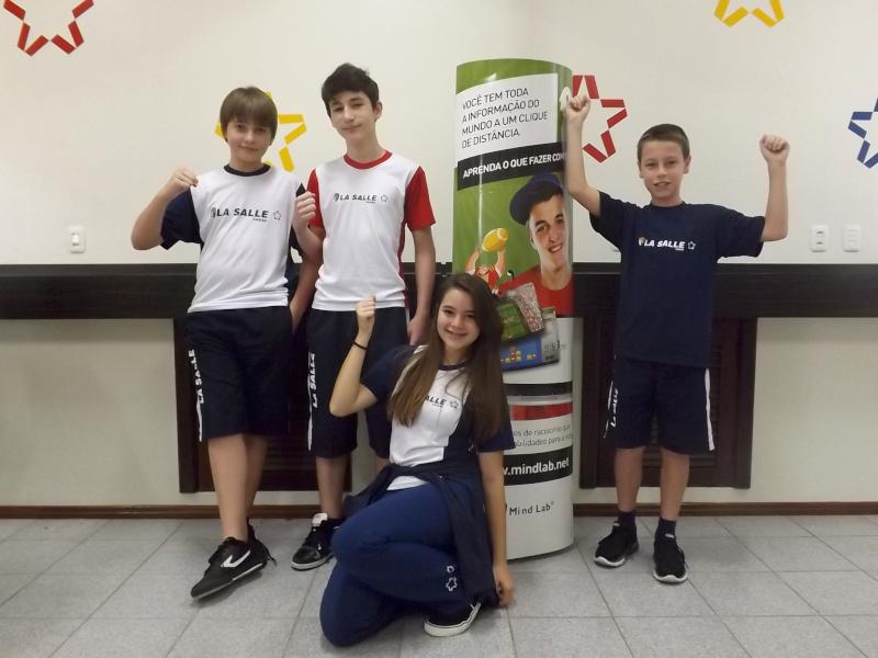 A árdua preparação valeu a pena: divulgados os resultados oficiais, é com muito orgulho que o La Salle Caxias parabeniza sua equipe da VIII Olimpíada de Raciocínio MindLab pelo 1° lugar em seu grupo e pela classificação à fase nacional da competição! Na última terça-feira, dia 5, a segunda fase da categoria de 4° a 7° ano ocorreu em uma tarde de grandes emoções. No subgrupo 331, os alunos somaram 19,5 pontos, superando oito escolas do Rio Grande do Sul, Santa Catarina e Paraná. Após, em disputa pelo primeiro lugar com o vencedor do subgrupo 332, o time acumulou duas vitórias, um empate e uma derrota, suficientes para garantir a classificação. Assim, no dia 14 de maio, Eduardo Zardo, Guilherme Elias, Matheus Ranzan e Pâmela Brandalise representarão a escola em São Paulo, na etapa nacional. O La Salle Caxias já está na torcida por seus campeões!