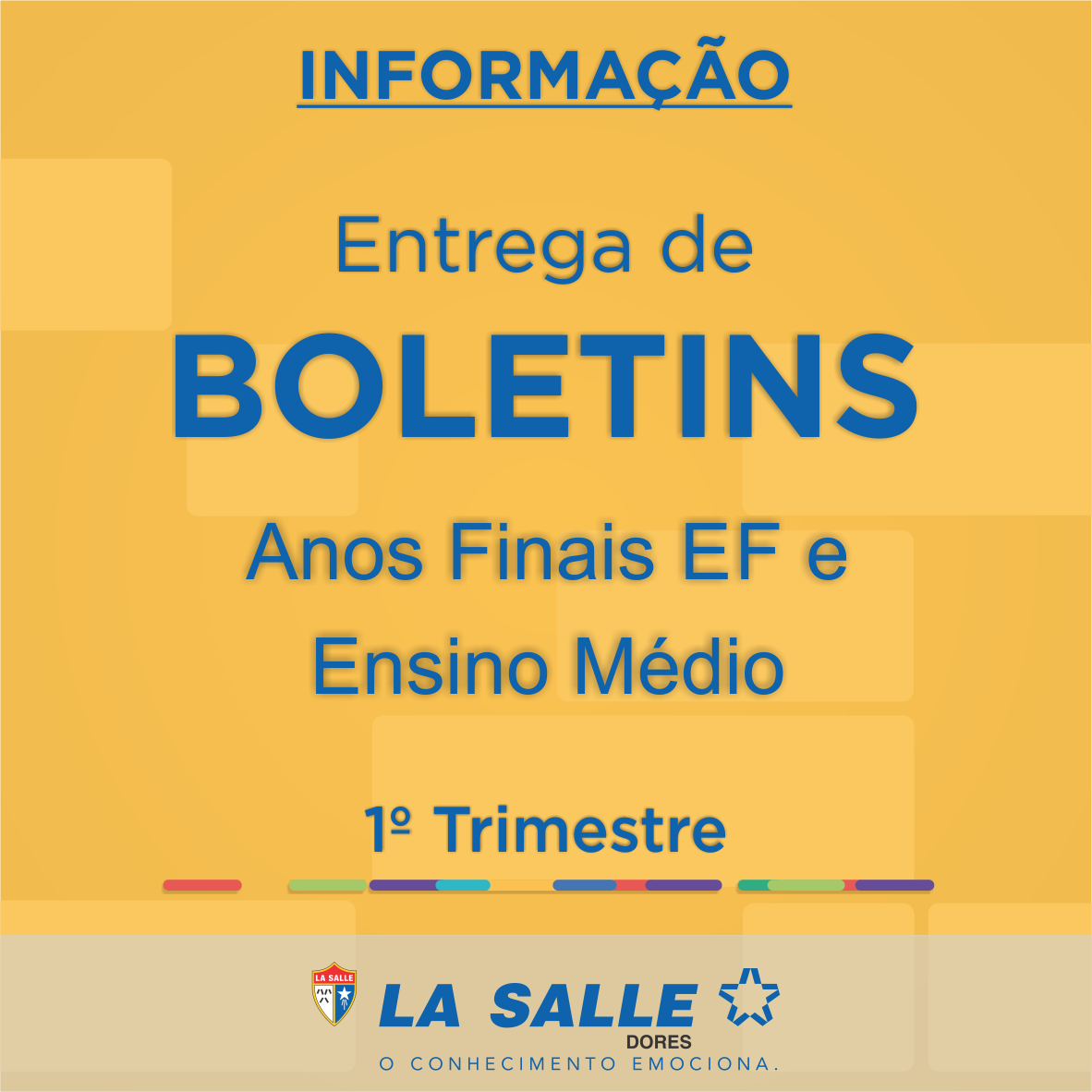 Informamos as datas e horários de entrega dos Boletins Trimestrais referentes ao 1º Trimestre, das turmas dos Anos Finais do Ensino Fundamental e do Ensino Médio. As salas de entrega serão informadas aos pais e/ou responsáveis no dia, na Recepção do Colégio.