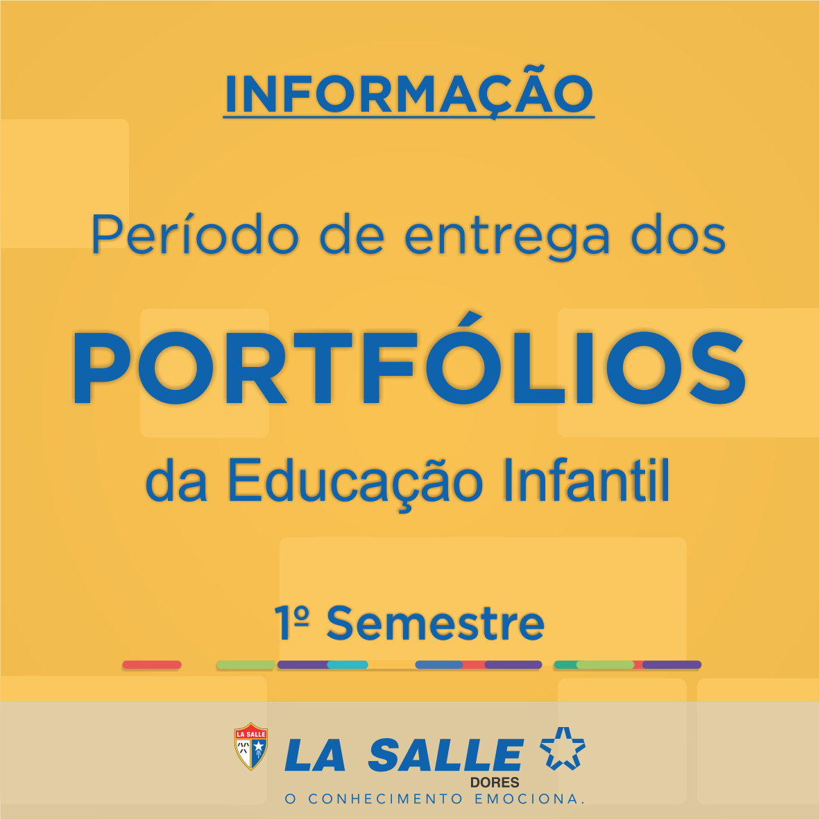 O Colégio La Salle Dores informa o período de entrega dos Portfólios da Educação Infantil. As datas seguem abaixo e os horários da entrega serão conforme agendado com a professora de cada turma.