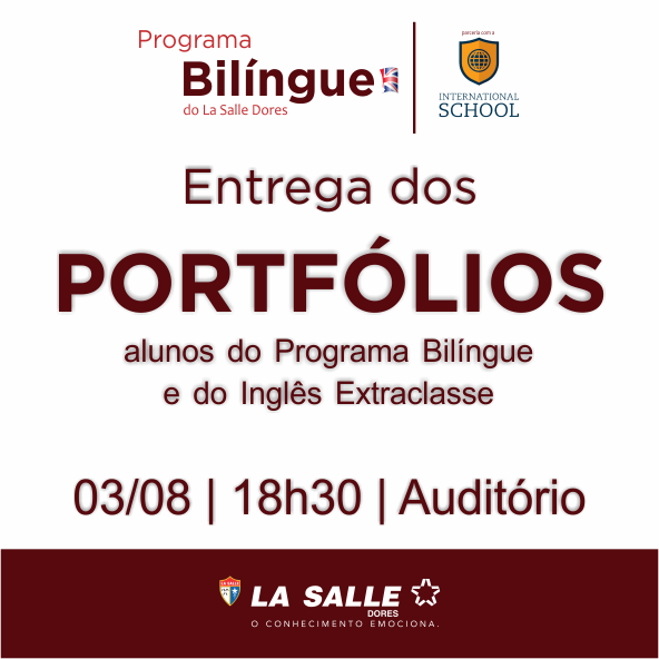 Convidamos a todos para a entrega dos Portfólios dos estudantes matriculados no Programa Bilíngue do Turno Integral e do Inglês Extraclasse, referentes às atividades realizadas no primeiro semestre. O encontro acontecerá no dia 03 de agosto, quarta-feira, das 18h30min às 20h30min, no Auditório do Colégio.