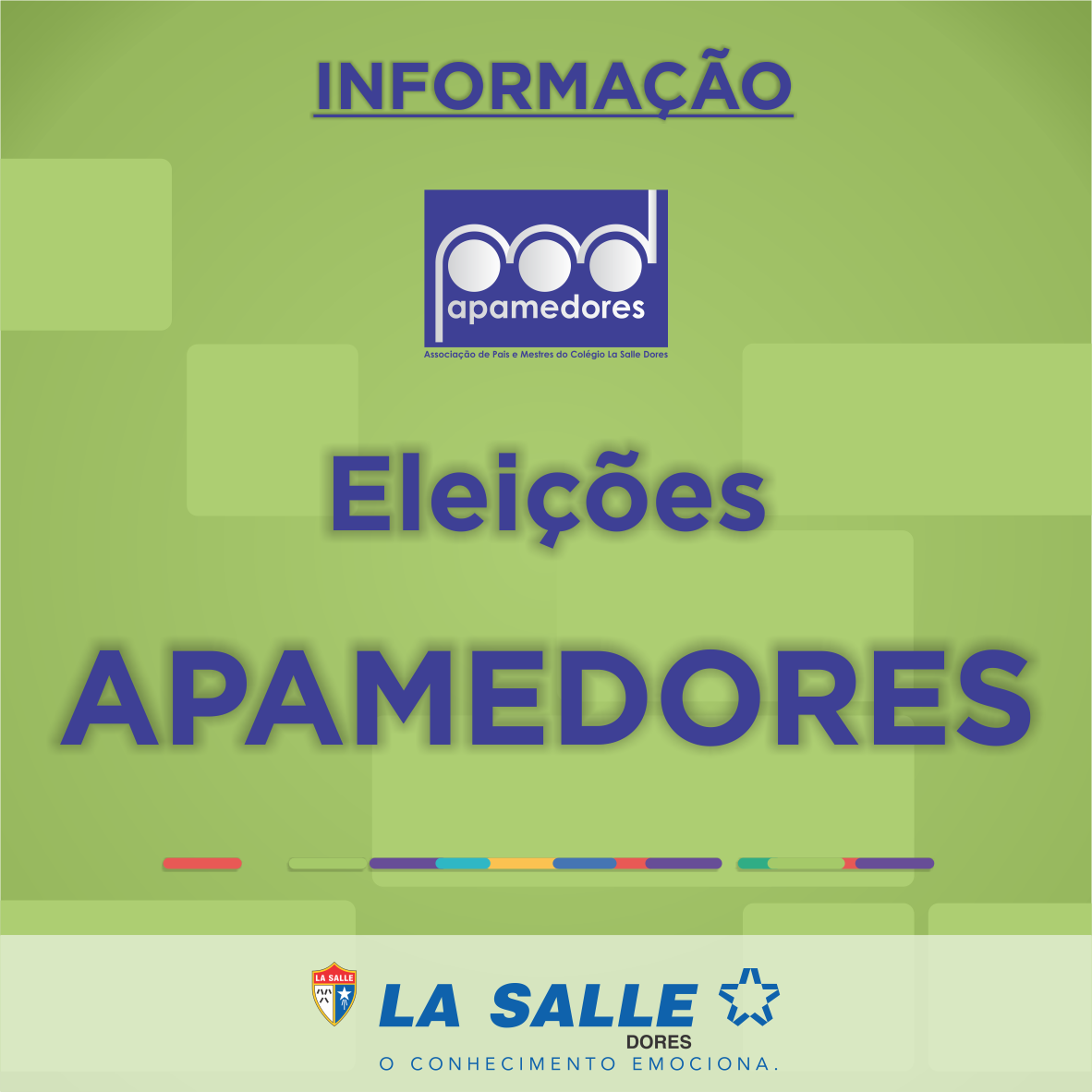 Em 2016, o Colégio La Salle Dores realizará eleições para a composição da Diretoria Executiva da APAMEDORES - Associação de Pais e Mestres do Colégio La Salle Dores. Assim, objetivando ampla participação da Comunidade Escolar Dorense, pedimos aos pais e/ou responsáveis que estejam conosco neste importante momento.