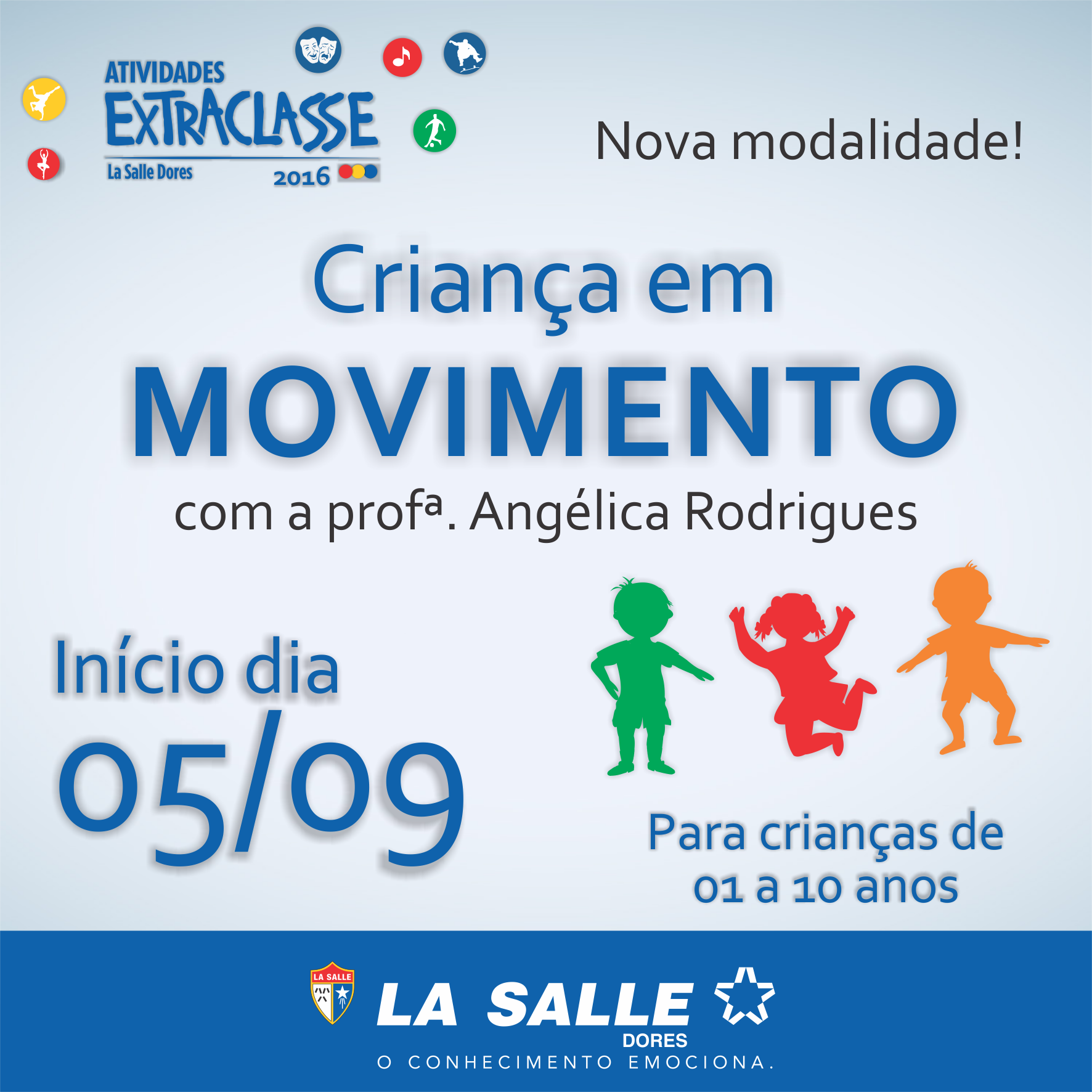 A partir do próximo mês, o Colégio La Salle Dores oferecerá mais uma opção de atividade extraclasse. No dia 05 de setembro iniciarão as aulas da modalidade "Criança em Movimento”, com a professora Angélica Rodrigues.