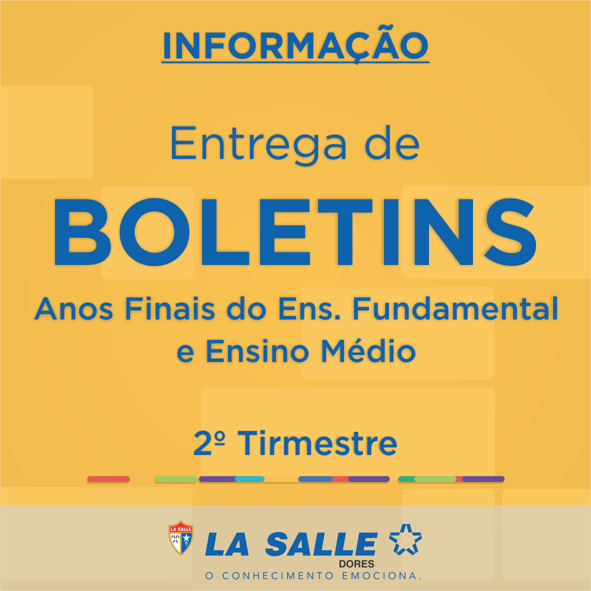 Informamos que na próxima quarta-feira, dia 14 de setembro, realizaremos a entrega de boletins das turmas dos Anos Finais do Ensino Fundamental e do Ensino Médio, referentes ao 2º trimestre de 2016.
