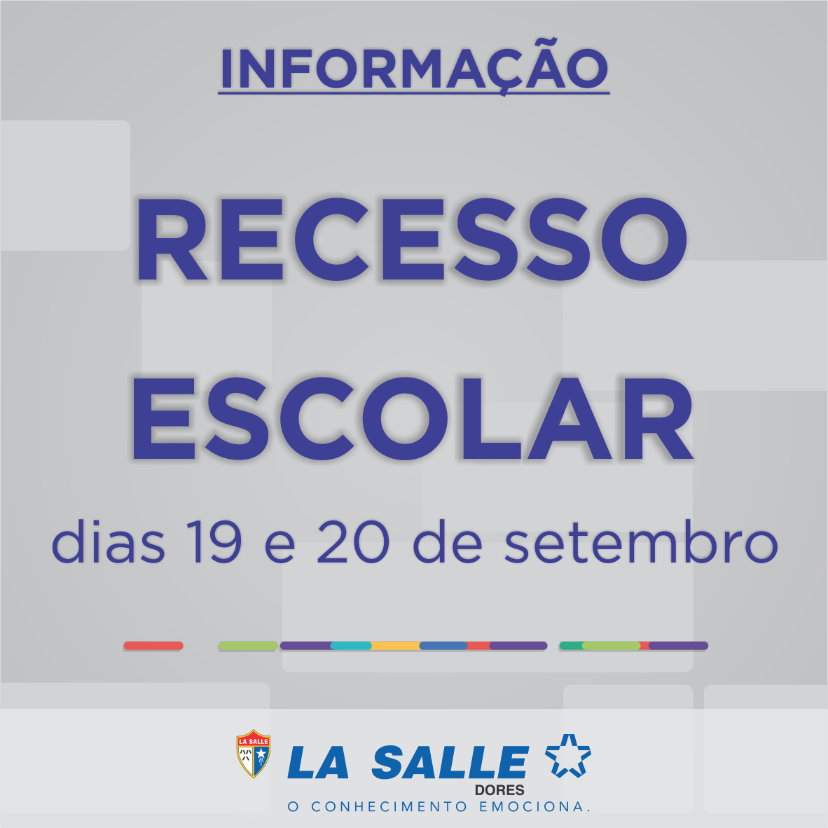 Em virtude do feriado alusivo à Revolução Farroupilha, e conforme Calendário Escolar da Rede La Salle, informamos que nos dias 19 e 20 de setembro, segunda-feira e terça-feira, o Colégio La Salle Dores estará de RECESSO ESCOLAR, retomando suas atividades na quarta-feira, dia 21 de setembro.