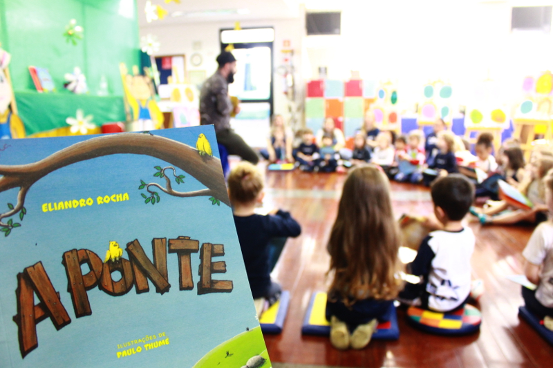 O escritor Eliandro Rocha visitou, ontem, o Colégio La Salle Dores para um divertido encontro com os pequenos das turmas da Creche 3. Além de uma contação de história, o autor bateu um papo com os alunos sobre o livro “A Ponte", leitura das turminhas neste semestre. A atividade aconteceu na Biblioteca do Colégio.