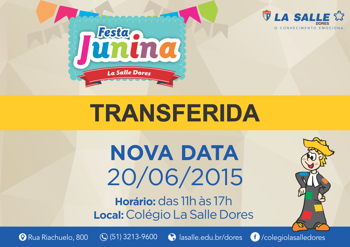 Informamos que devido a previsão de chuva para amanhã, 13 de junho, dia da nossa Festa Junina, iremos transferir o evento para o próximo sábado, dia 20 de junho.