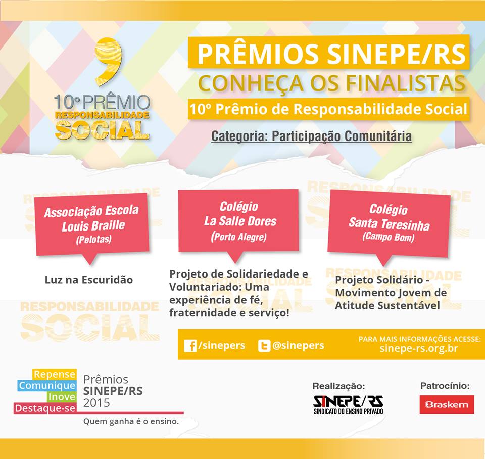 O Colégio La Salle Dores está entre os três finalistas do 10º Prêmio de Responsabilidade Social, do SINEPE/RS, na categoria "Participação Comunitária", com o trabalho "Projeto de Solidariedade e Voluntariado: Uma experiência de fé, fraternidade e serviço".
