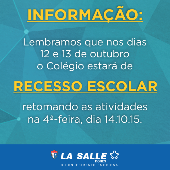 Em virtude do feriado de Nossa Senhora Aparecida, e conforme acordo firmado com entidades sindicais referente ao Dia do Professor, Informamos que nos dias 12 e 13 de outubro o Colégio La Salle Dores estará de RECESSO ESCOLAR, retomando suas atividades na quarta-feira, dia 14 de outubro.