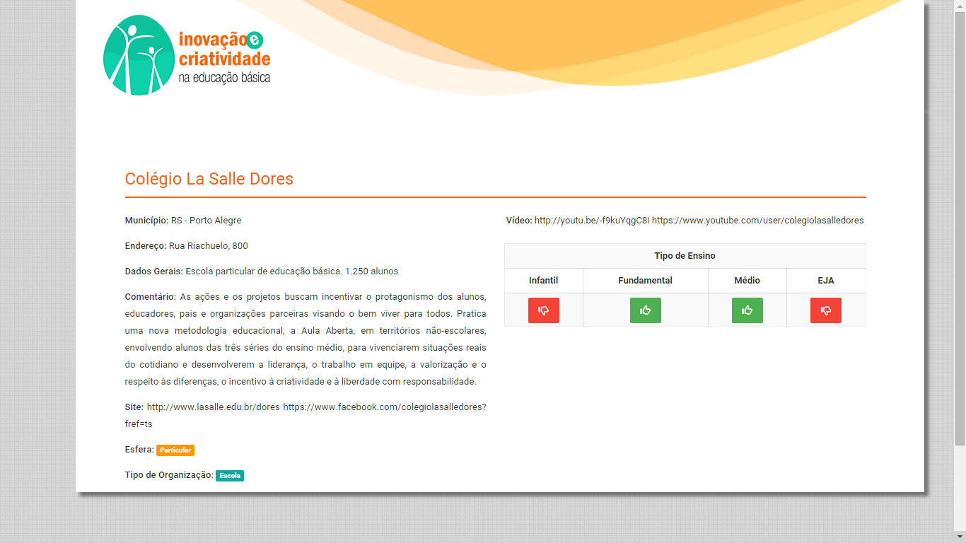 O Colégio La Salle Dores está entre as 178 instituições brasileiras reconhecidas pelo Ministério da Educação como exemplos de inovação e criatividade na Educação Básica, conforme demonstrado no Mapa da Inovação e Criatividade na Educação Básica, lançado no dia 22 de dezembro de 2015.