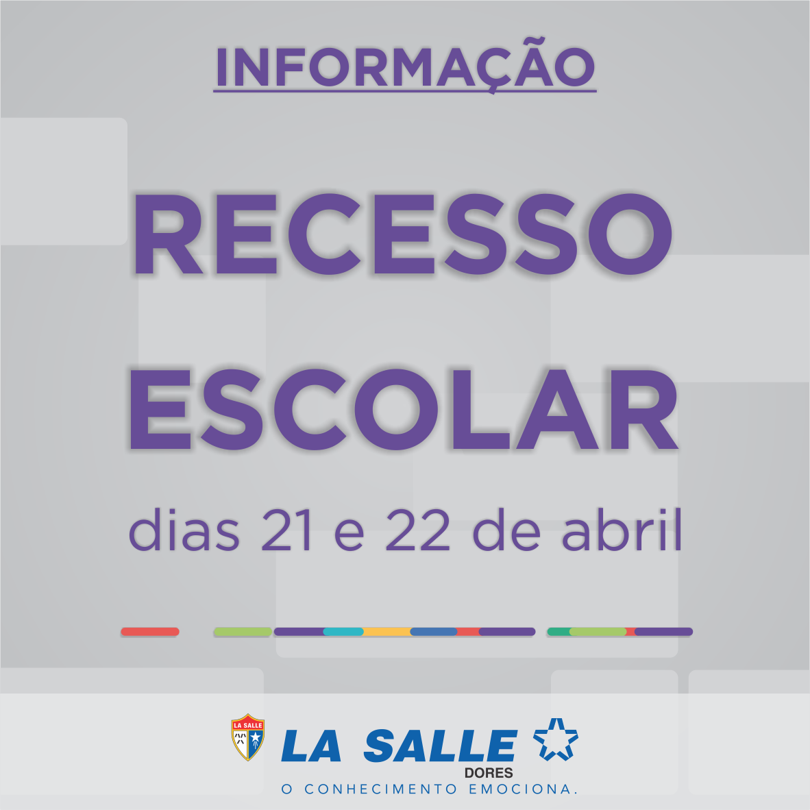 Em virtude do feriado nacional de Tiradentes, e conforme Calendário Escolar da Rede La Salle, informamos que nos dias 21 e 22 de abril, quinta-feira e sexta-feira, o Colégio La Salle Dores estará de RECESSO ESCOLAR, retomando suas atividades na segunda-feira, dia 25 de abril.