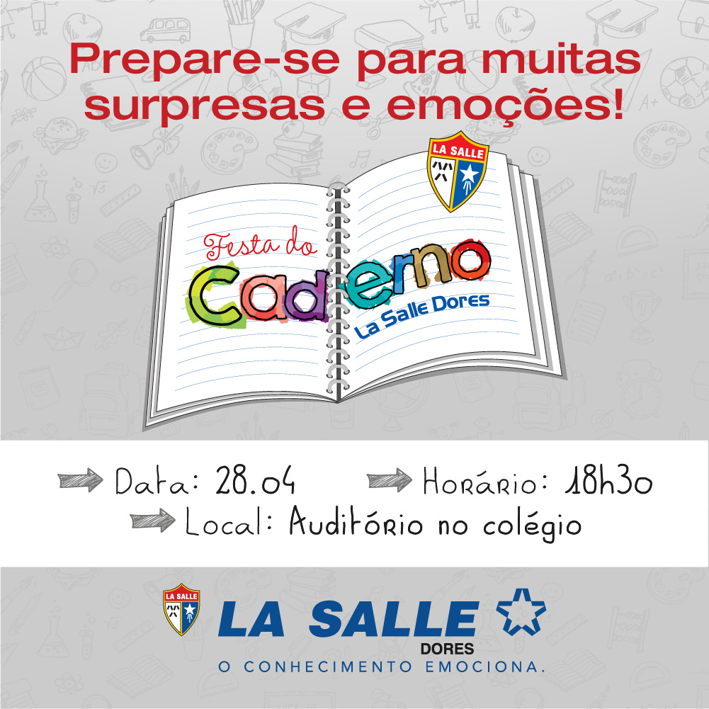 Convidamos Pais e/ou Responsáveis dos alunos das turmas do 1º Ano do Ensino Fundamental para a Festa do Caderno, a ser realizada na próxima quinta-feira, 28 de abril.