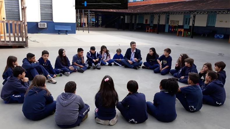 Os alunos dos 4° anos, participaram da aula de religião no pátio da escola com o Professor Milton que ministra as ciências humanas juntamente com a professora titular.