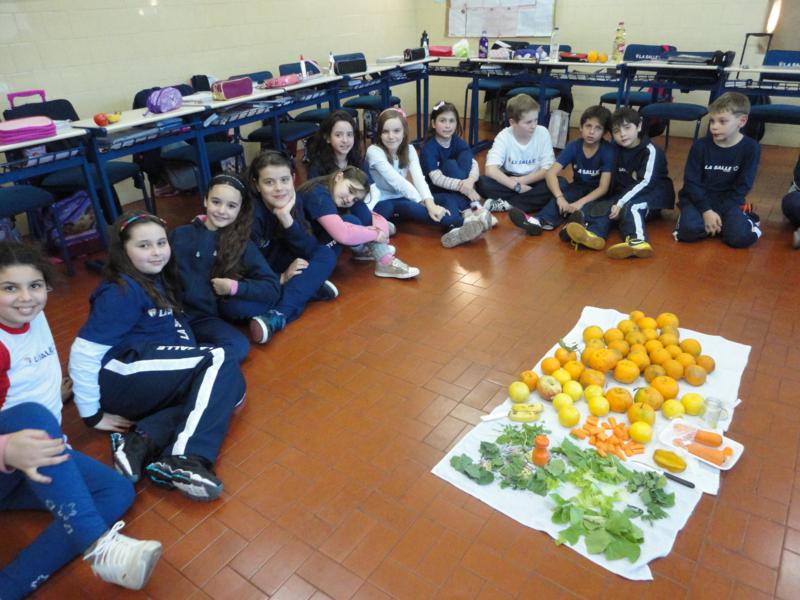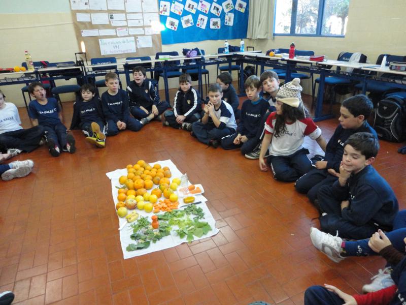 na sala, degustamos frutas, verduras, legumes, comparamos preços, consideramos