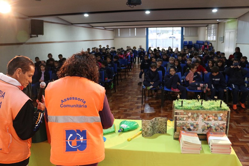 Os estudantes do 2º ano do EF participaram também no dia de hoje de uma palestra com a Assessoria Comunitária do Departamento Municipal de Limpeza Urbana (DMLU), que falou sobre a mudança da nomenclatura dos tipos de resíduos (orgânico, rejeito e reciclável), além de brincadeiras para identificar cada tipo de lixo. Os representantes do DMLU trouxeram uma exposição de diferentes artigos confeccionados com objetos reciclados, além de uma caixa de vidro com protótipo de um aterro sanitário de minas do leão, para onde o lixo da capital e outros municípios são levados.