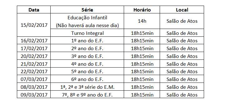 Para que as famílias possam se organizar para este início de ano letivo, comunicamos as datas das reuniões pedagógicas, conforme calendário abaixo: