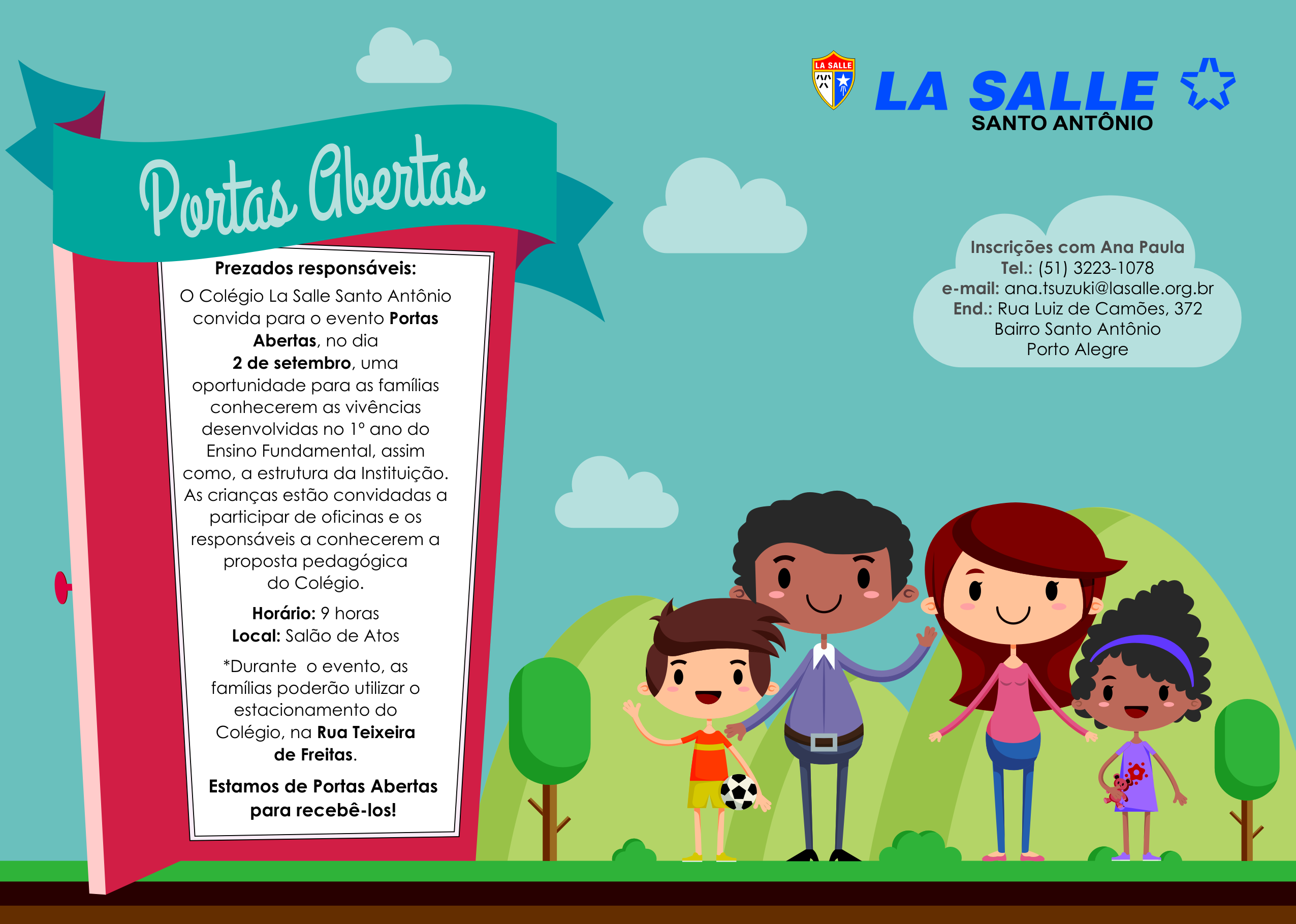 No sábado (2/9), às 9h, acontece no Salão de Atos do Colégio La Salle Santo Antônio, o evento “Portas Abertas”. O projeto é uma oportunidade para as famílias conhecerem as vivências desenvolvidas no 1º ano do Ensino Fundamental, assim como, a estrutura da instituição. As crianças estão convidadas a participar de oficinas durante a atividade, enquanto os pais conhecem a proposta pedagógica do Colégio. Durante o evento, as famílias poderão utilizar o estacionamento do Colégio, na Rua Teixeira de Freitas.