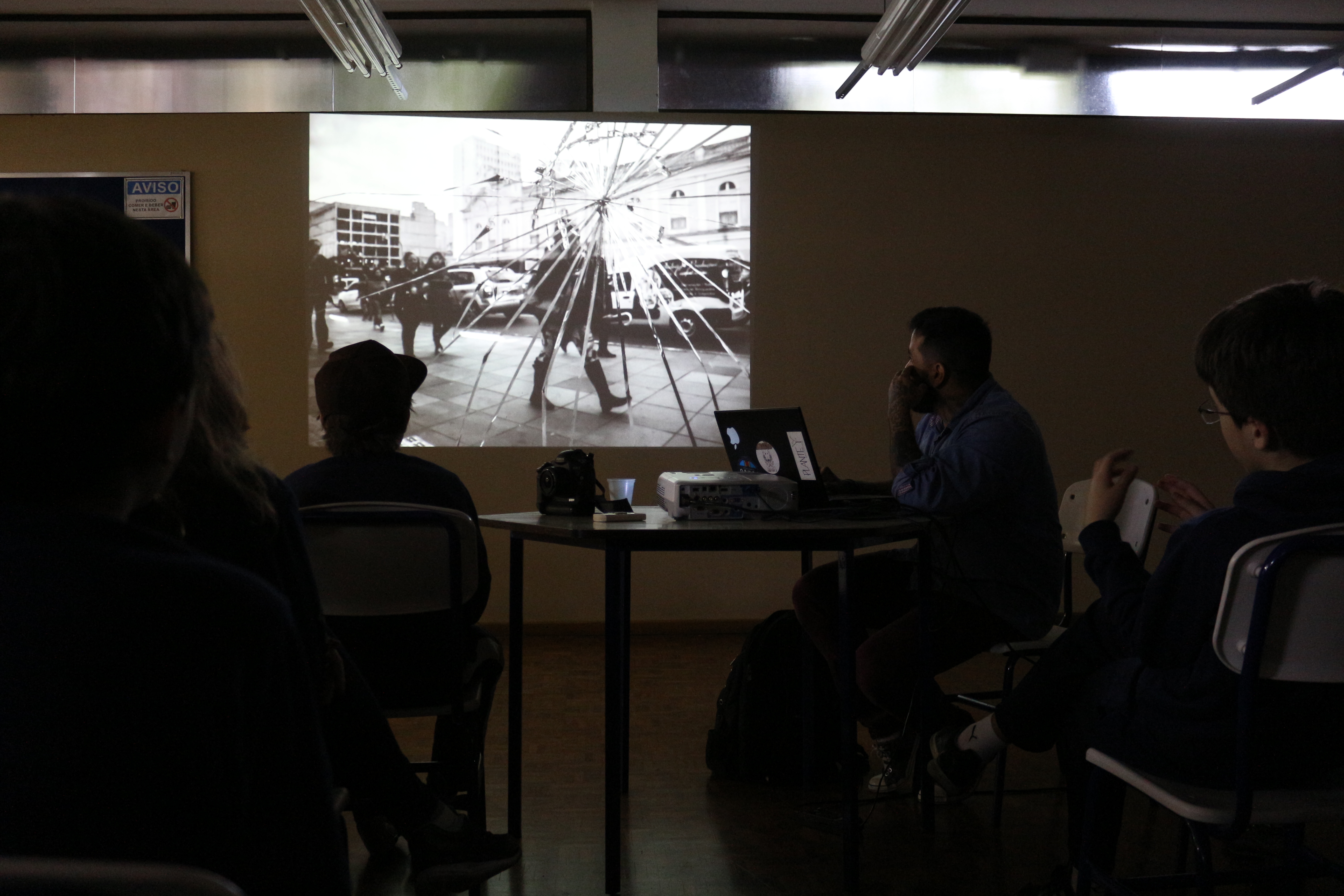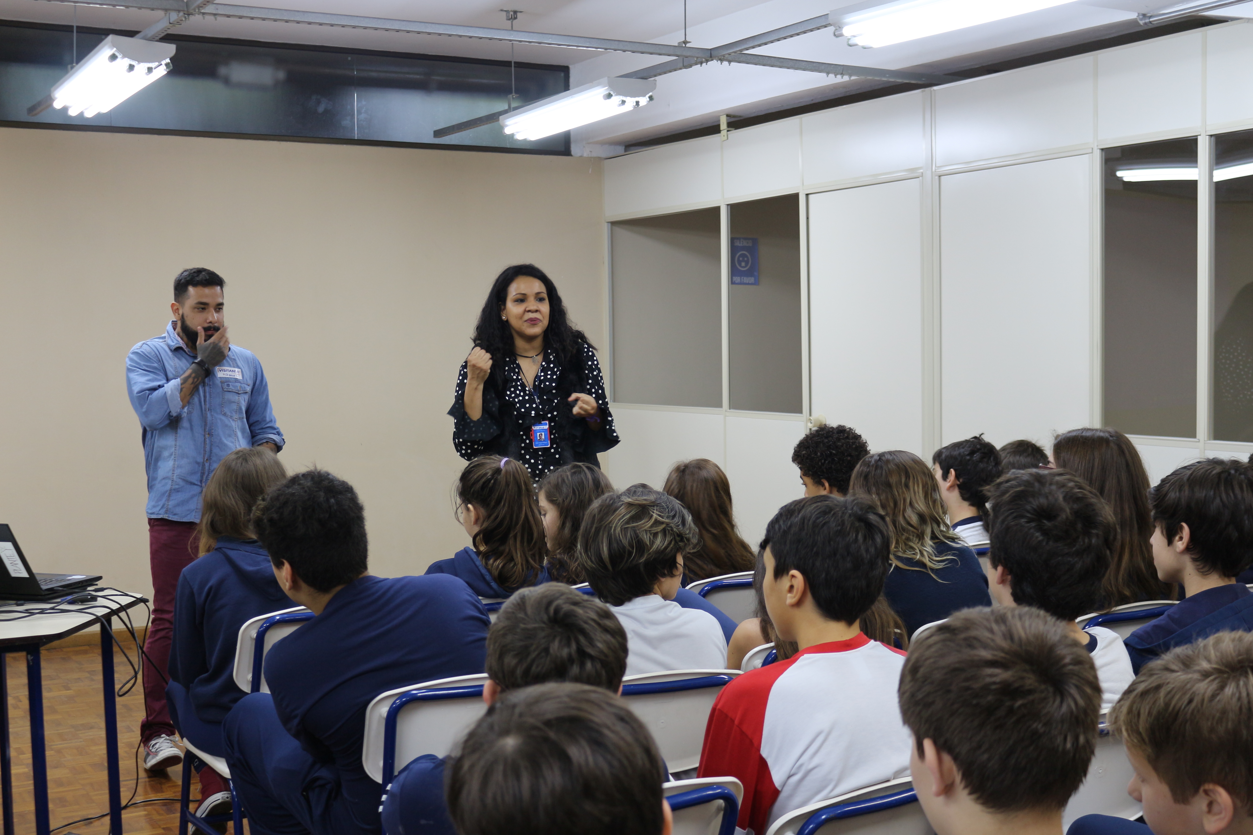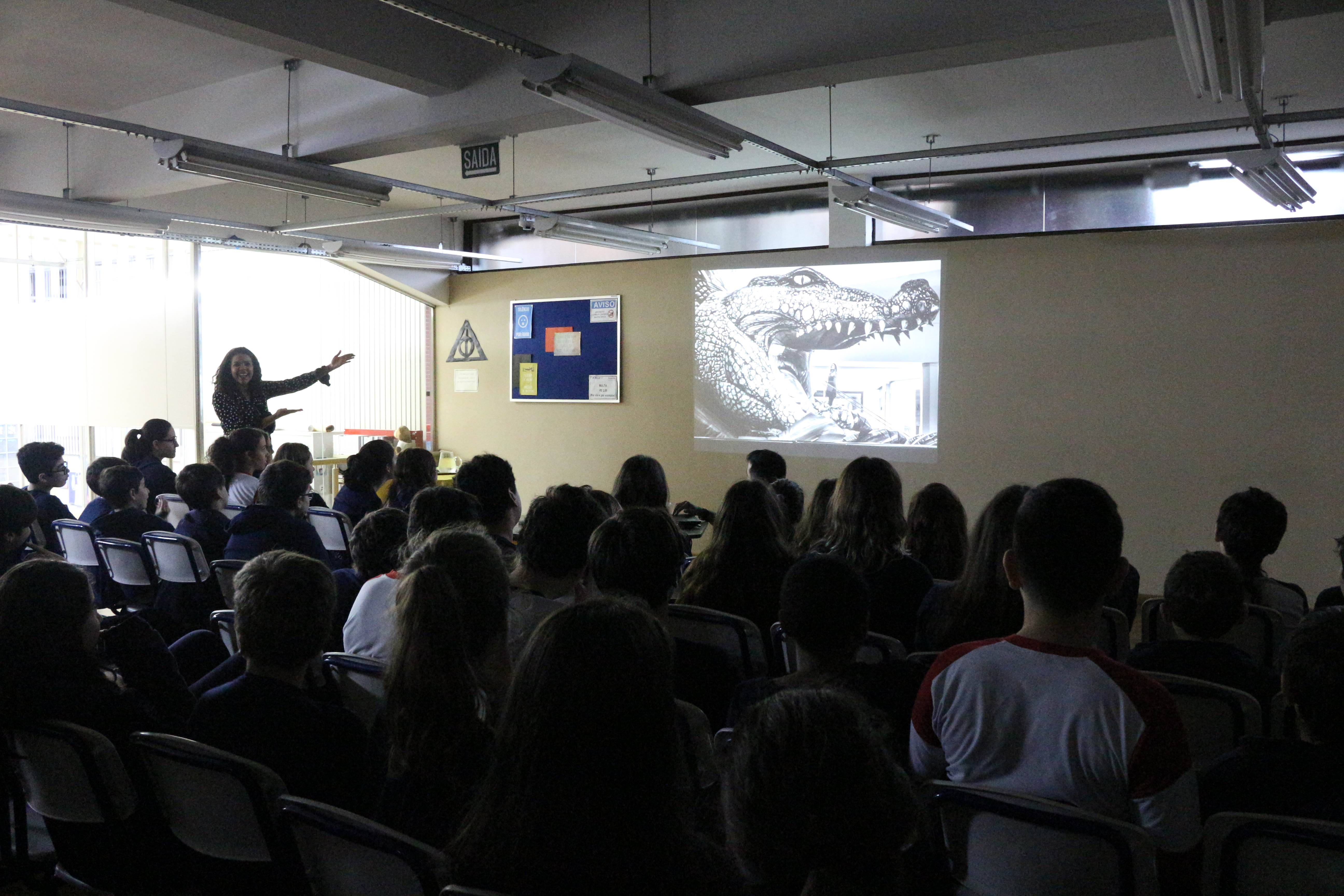 Hoje (15/9), pela manhã, as turmas do 7º ano do Ensino Fundamental deram continuidade ao projeto literário “Tá tendo poesia!”. Esse projeto é desenvolvido pela professora de português, Carla Mendes Tergolina. Os estudantes, que já haviam recebido a bibliotecária Annie Casali para falar sobre Poesia Urbana, receberam, hoje, a visita do fotógrafo Pedro Antônio Heinrich que é especialista em fotografia de rua (Street Photo) e ambientes urbanos. A proposta é que a partir da oficina os alunos produzam fotos que servirão de inspiração para a escrita de poemas sobre o urbano e a relação entre os indivíduos e a cidade.