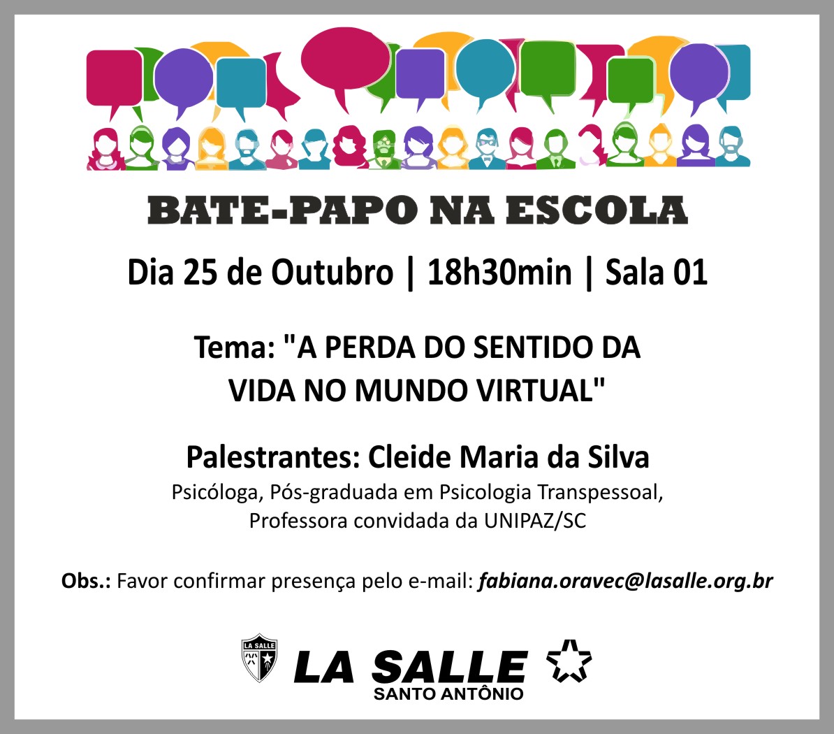 A edição do Bate-Papo na Escola do mês de outubro acontecerá na próxima quarta-feira (25/10), às 18h30min, na sala 01, do Colégio La Salle Santo Antônio. O tema abordado será "A PERDA DO SENTIDO DA VIDA NO MUNDO VIRTUAL", com a palestrante Cleide Maria da Silva (Psicóloga, Pós-graduada em Psicologia Transpessoal, Professora convidada da UNIPAZ/SC). Favor confirmar presença pelo e-mail: fabiana.oravec@lasalle.org.br. Participe!
