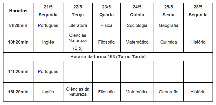 A partir do dia 21/5, segunda-feira, terão início as provas trimestrais (1º trimestre), as turmas do 6º ao 9º do Ensino Fundamental e Ensino Médio. Na segunda-feira, dia 28/5, as turmas irão realizar as provas de redação.