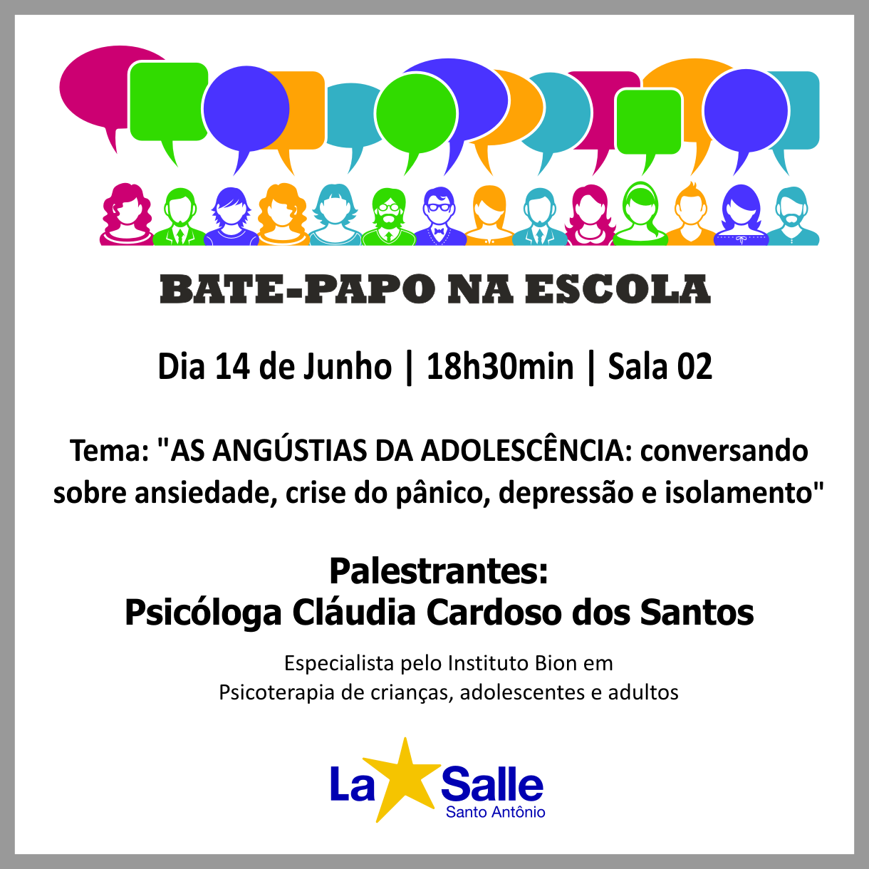 O Colégio La Salle Santo Antônio realiza na próxima quinta-feira (14/6) o Bate-Papo na Escola, às 18h30min, na sala 02. A edição que ocorreria no dia 29/5, foi transferida devido à dificuldade de deslocamento em função da falta de combustível com a Greve dos caminhoneiros.