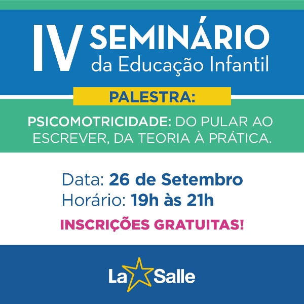 O Colégio La Salle Santo Antônio, promove o IV Seminário da Educação Infantil, no dia 26/9, às 19h, no Salão de Atos. O curso tem como objetivo dar continuidade a formação dos Educadores de Educação Infantil, e abordará o tema “Psicomotricidade: do pular ao escrever, da teoria à prática”, com o Psicomotricista Juliano Padilha.