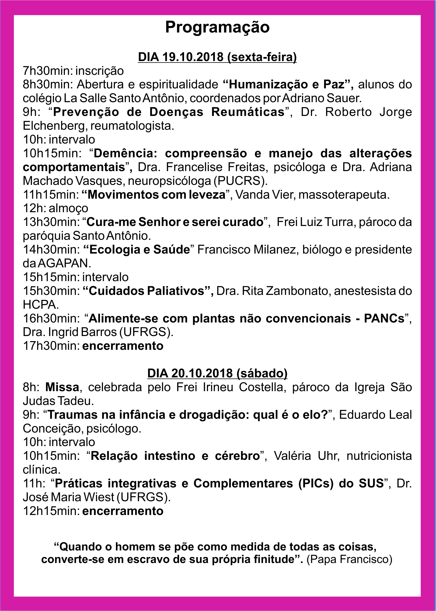 O evento é promovido pela Pastoral da Saúde. Mais informações podem ser obtidas pelo telefone (51) 3223-2062. As inscrições podem ser feitas na secretaria do local. A Paróquia pede uma contribuição de R$ 10,00 para as atividades nos dois dias e R$ 15,00 para o almoço, que é opcional.