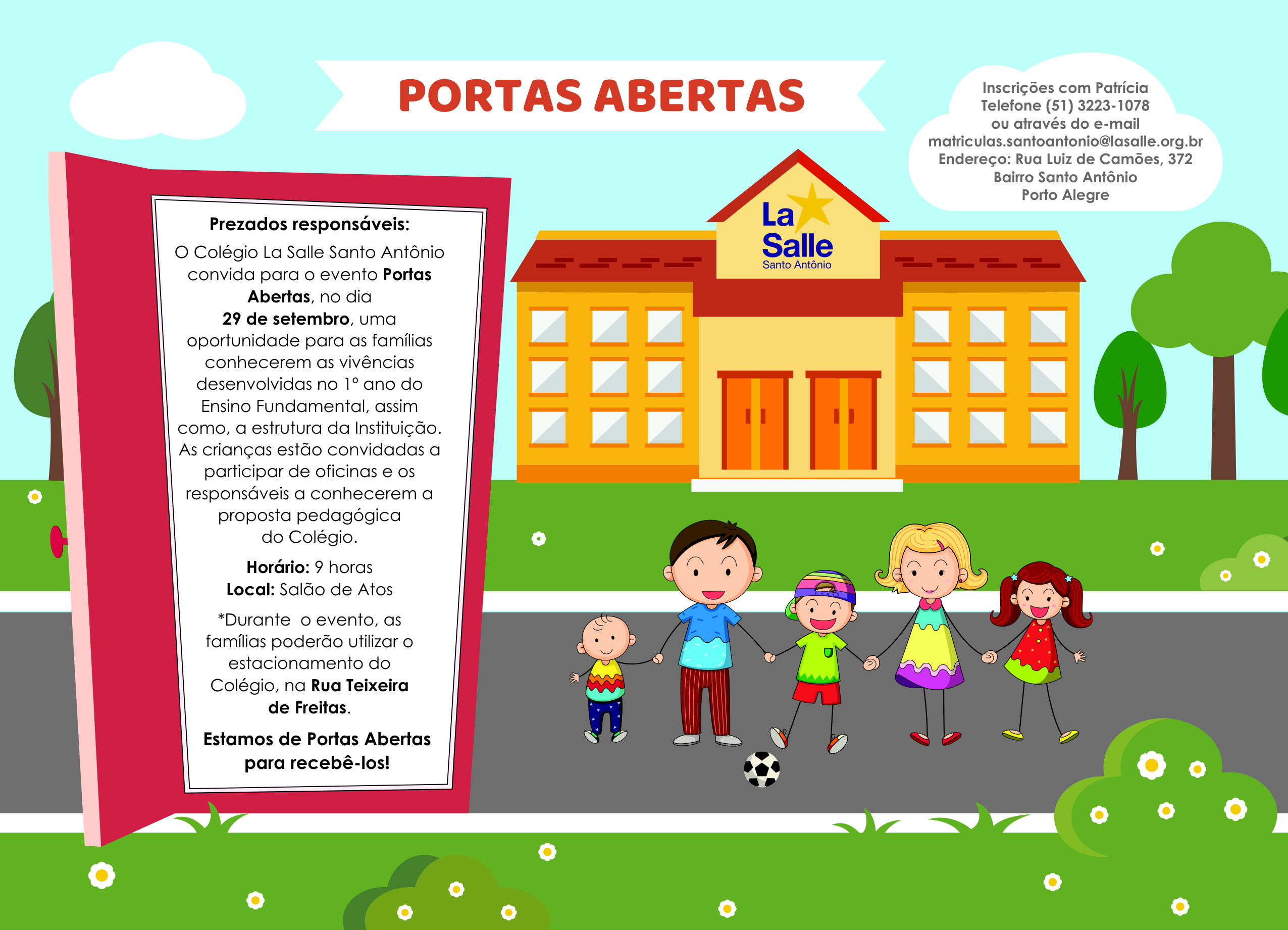 No sábado (29/9), às 9h, acontece no Salão de Atos do Colégio La Salle Santo Antônio, o evento “Portas Abertas”. O projeto é uma oportunidade para as famílias conhecerem as vivências desenvolvidas no 1º ano do Ensino Fundamental, assim como, a estrutura da instituição. As crianças estão convidadas a participar de oficinas durante a atividade, enquanto os pais conhecem a proposta pedagógica do Colégio. Durante o evento, as famílias poderão utilizar o estacionamento do Colégio, na Rua Teixeira de Freitas.
